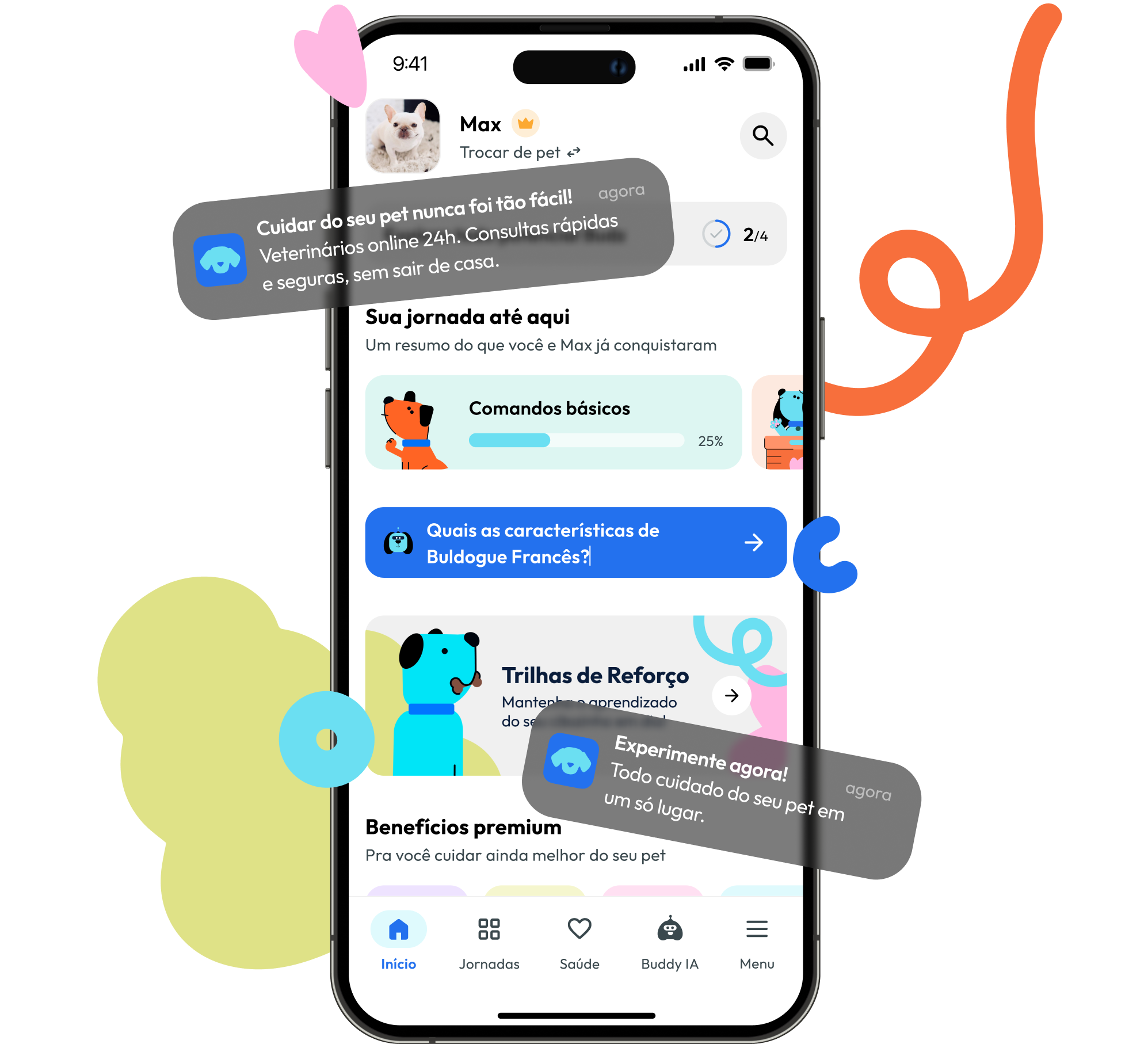 Tire qualquer dúvida, 24 horas por dia! O Buddy IA é uma inteligência artificial desenvolvida para auxiliar os tutores com informações sobre cuidados, alimentação, saúde e dicas personalizadas com base no perfil do animal.